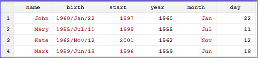 (2)如果我们想提取birth变量下的年、月、日信息,并将对应内容放到新变量中,操作如下: