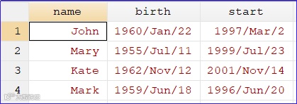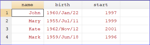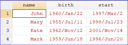 "Mary" "1955/Jul/11" "1999/Jul/23"