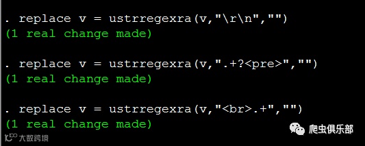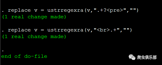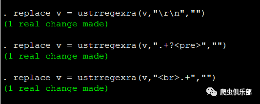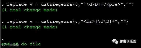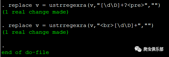 奇怪的是,程序运行结果显示观测值确实发生了变化,但是我们看到Stata内存中的数据,开头部分的字符串仍然没有删除掉,这是为什么呢?在推文“用正则表达式揭开回车键的面纱”中,我们讲到在windows操作系统中是把\r\n用作文本行的结束标签,而元字符“.”可以匹配除了回车符(\r)和换行符(\n)之外的任意字符,所以由于这里存在着换行符(\n)和回车符(\r),而元字符“.”不能匹配到它们,因此匹配结果仅仅是位于字符串“<pre>”的所在行以及字符串“<br>”的所在行。要解决这个问题,有两种思路:
