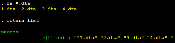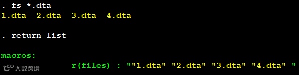 local files: dir "." files "*.dta" //利用宏扩展函数,将当前缺省路径下所有的dta文件的文件名放到局部宏files中