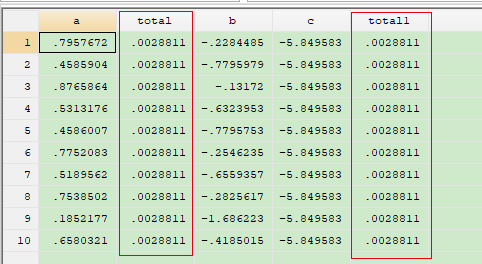 我们首先生成变量a的对数b;然后生成b变量的加总和c;最后算出以e为底、以c为指数的运算结果,用变量total1来表示。
