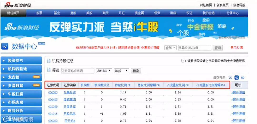 我们首先打开新浪财经网页进入数据中心,机构持股汇总页面,选择年份为2016年年报,点击第四页:
