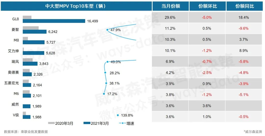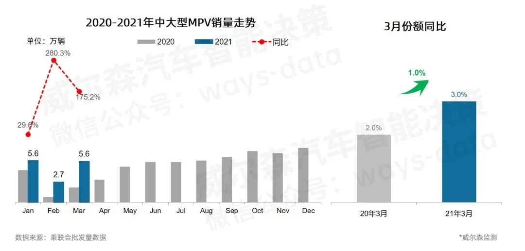 3月中大型MPV销量为5.6万辆,同比增长175.2%;份额为3.0%,同比增长1.0%。