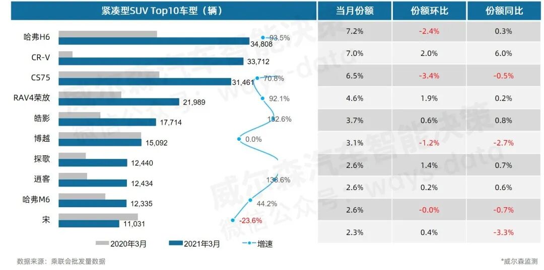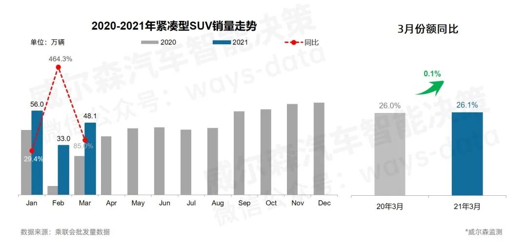 3月紧凑型SUV销量为48.1万辆,同比增长85%;份额为26.1%,同比增长0.1%。