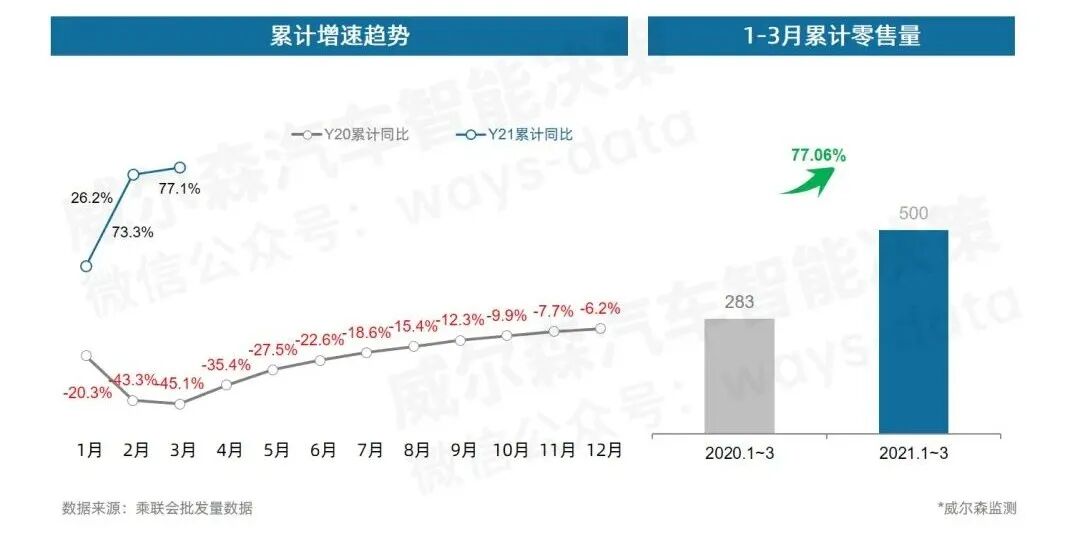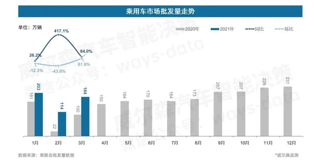 3月,整体乘用车市场批发量为184万辆,同比上升84%,环比上升61.9%;2021年第一季度累计销量500万辆,相比去年第一季度疫情扩散影响正常批车导致的相对较低的基数,累计同比上升77.06%;对比2月春节期间较低的批发量,环比上升61.9%。