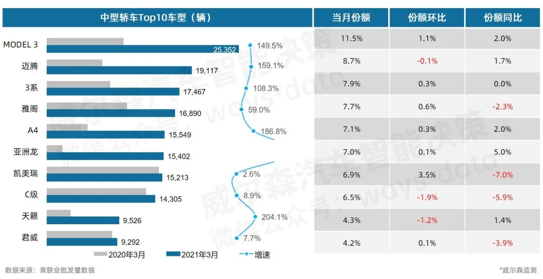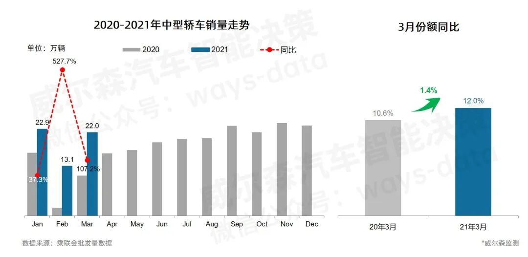 3月中型轿车销量为22万辆,同比增长107.2%;份额为12%,同比增长1.4%。