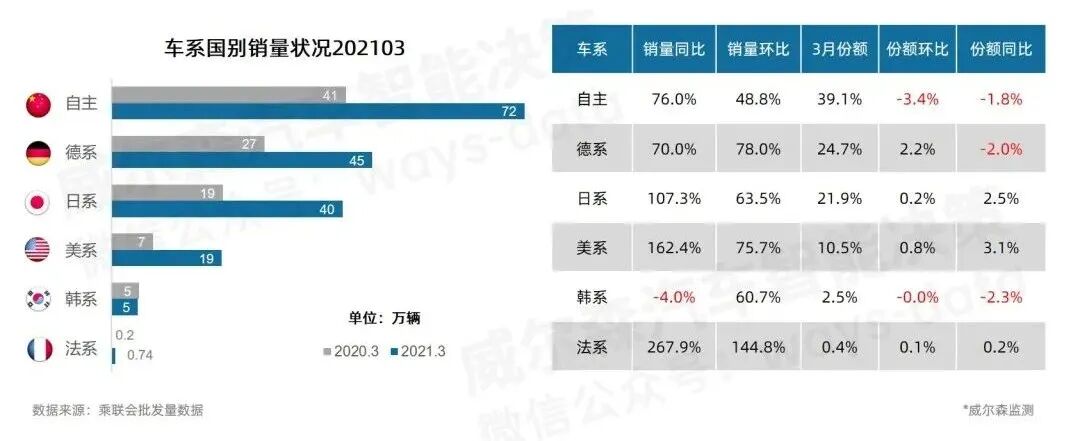 3月,除韩系销量同比略有下降外,其余系别均为同比环比双增长;其中美系品牌表现最为亮眼,销量同比增长162.4%,且份额同比增长3.1%。