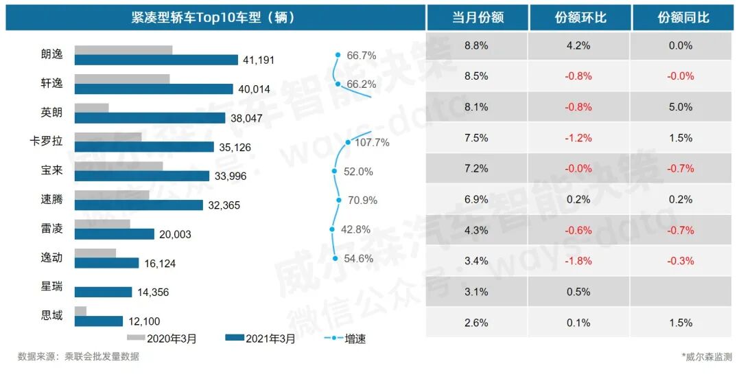 3月紧凑型轿车销量为47万辆,同比增长66.7%;份额为25.5%,同比下降2.7%。