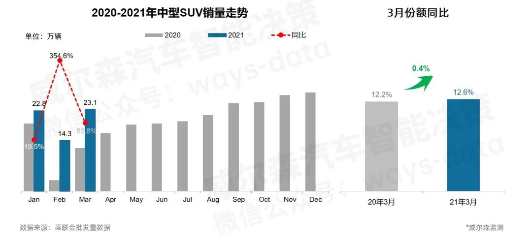 3月中型SUV销量为23.1万辆,同比增长88.8%;份额为12.6%,同比增长0.4%。