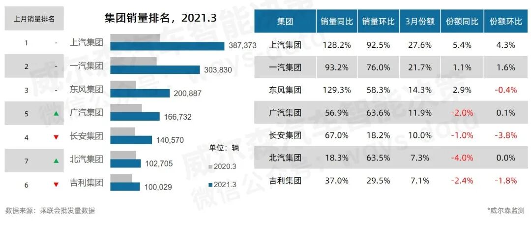 3月,各大集团销量同比均呈现正增长,其中上汽集团、一汽集团和东风集团以翻倍的增长稳居前三名,份额同比也均有上升,后四大集团的份额同比有所丢失,需继续发力。