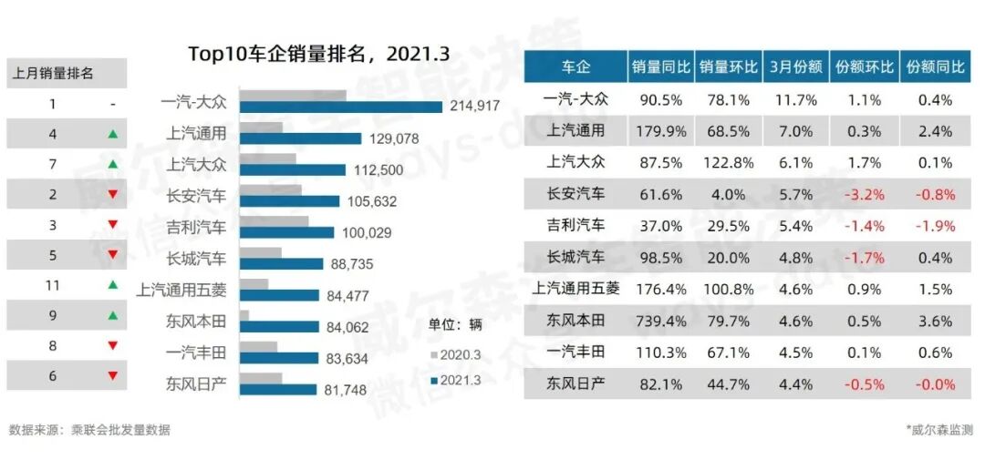 3月TOP10车企中,相较2月,榜单格局经历大洗牌;除一汽-大众稳居榜首外,其余均有变动;其中上汽的通用和大众均表现亮眼,分别从2月的第四名和第七名夺得3月亚军和季军,份额同比也略有上升。
