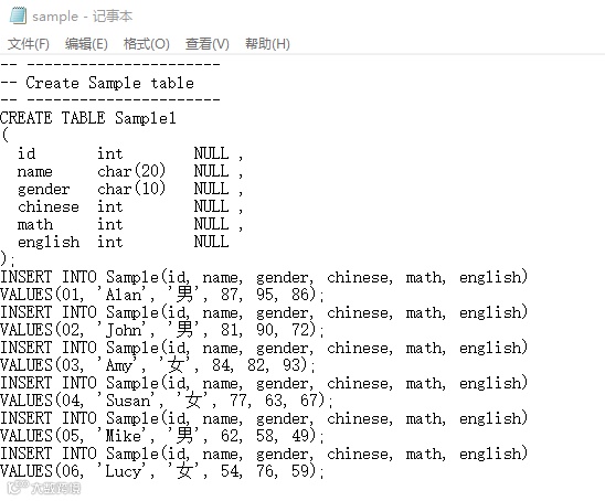 可以看到,在sample.txt这个脚本中,就有着创建一个sample表的语句,那么只要加载这个脚本,就可以在数据库中创建表啦。