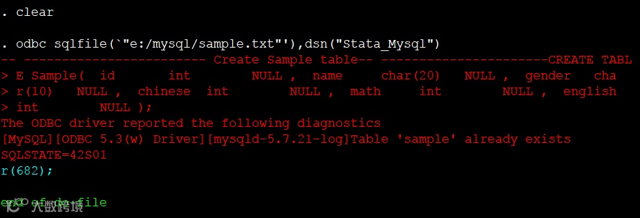可以看到Stata告诉我们名为sample的表已经存在了,这是因为小编在学习之前的推文时,已经在mysql数据库中导入了一个名为sample的表,如果有读者也曾对着之前的推文进行了操作的话也会遇到这个错误。要注意,MySQL中的表名是不能重复的!