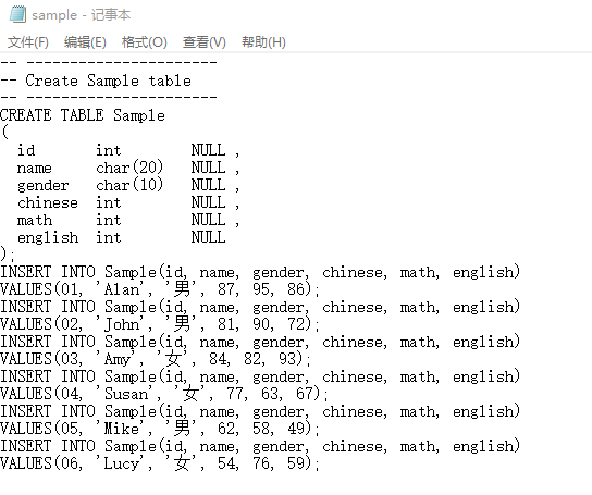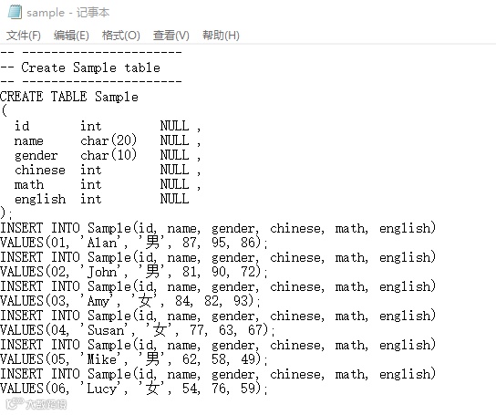 与odbc exec不同的是,我们不是直接在Stata中敲下MySQL中创建表的语句,而是先将语句保存在一个记事本中,这些由一句句SQL语句构成的文档我们称为sql脚本,“一般来说sql脚本文件的后缀名为.sql,如sample.sql,但这不是必须的要素,只要文档内容是SQL语句,文档后缀名是什么并没有关系,Stata以及MySQL依然会正常读取运行,如我们的例子sample.txt就是这样”,odbc sqlfile即会运行该脚本里的内容。以上篇推文《Hello,MySQL——odbc insert导入stata数据》的sample.txt为例,我们先来查看一下其具体内容: