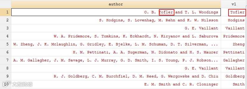 结果如上图所示:我们提取出了每个观测值的第一个姓氏,那么如何提取第二个的姓氏呢?