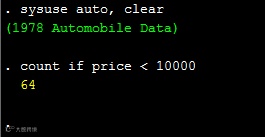 结果显示64,那么这结果是什么意思呢?我们的命令又是什么意思呢?这里count if 是计算满足某种条件的数据的总计。也就是说,满足价格小于10000的数据总共有64个。这个命令有个返回值,我们来看一下他的返回值是什么样的,输入命令: