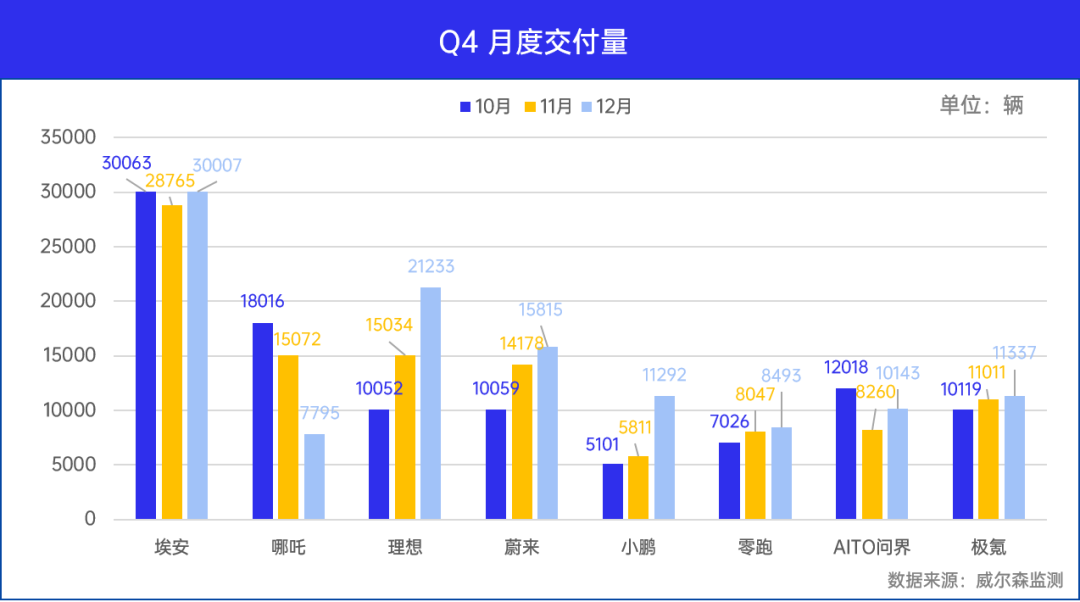 从传统车企脱胎而来的广汽埃安火力十足,在12月收官之战中,月销量突破3万辆大关,也成为造车新势力销冠。哪吒汽车虽然环比出现不小幅度的下滑,月销量甚至未突破万辆大关,但凭借前期出色的表现,拿下造车新势力销量亚军。理想汽车收官之战中,月销量首破2万辆大关,年销量排名第三。
