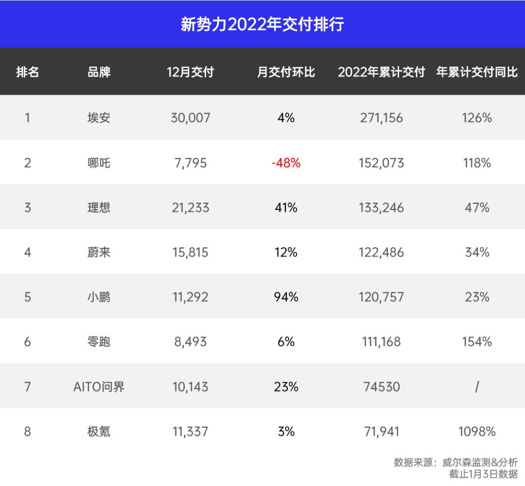蔚来和小鹏全年交付量均超12万辆,分别居第四和第五;AITO和极氪发展迅猛,2022全年交付量均超7万辆,正在向10万辆俱乐部进发,为2022年出色的成绩画上了一个完美句号。
