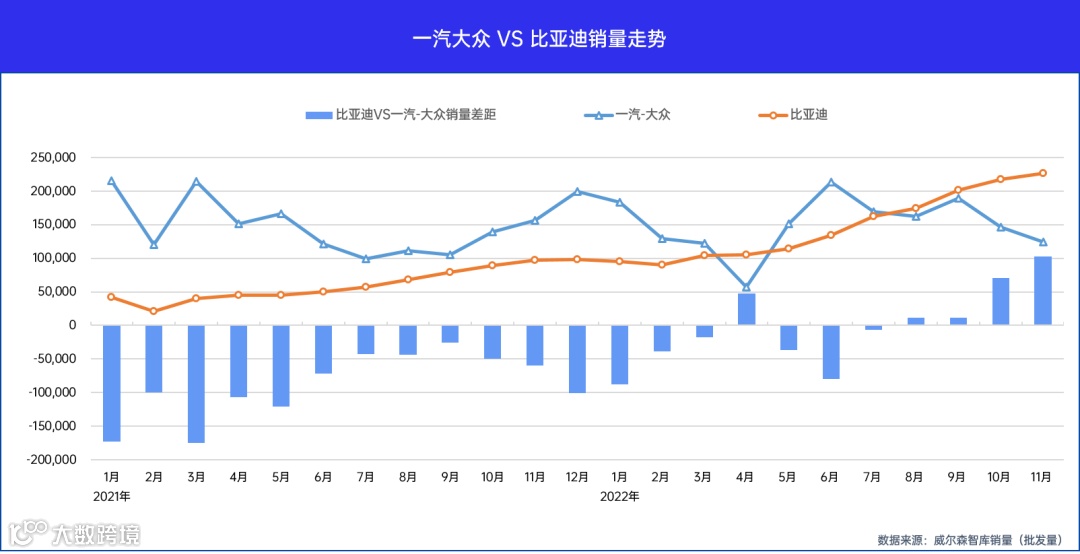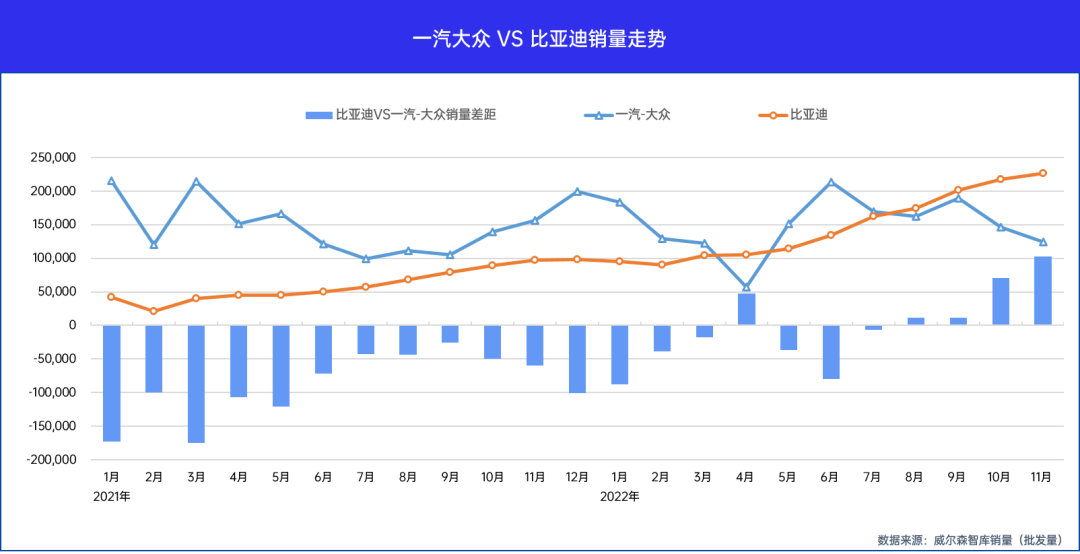 从8月开始,比亚迪月销量连续4个月反超一汽-大众且不断加速拉大差距,11月已反超一汽-大众超10万台,1-11月累计销量仅比一汽-大众落后不到2.5万台。按此销量增长态势,比亚迪挤下一汽-大众创下自主品牌一举登上年度销冠的历史,可谓是毫无悬念。