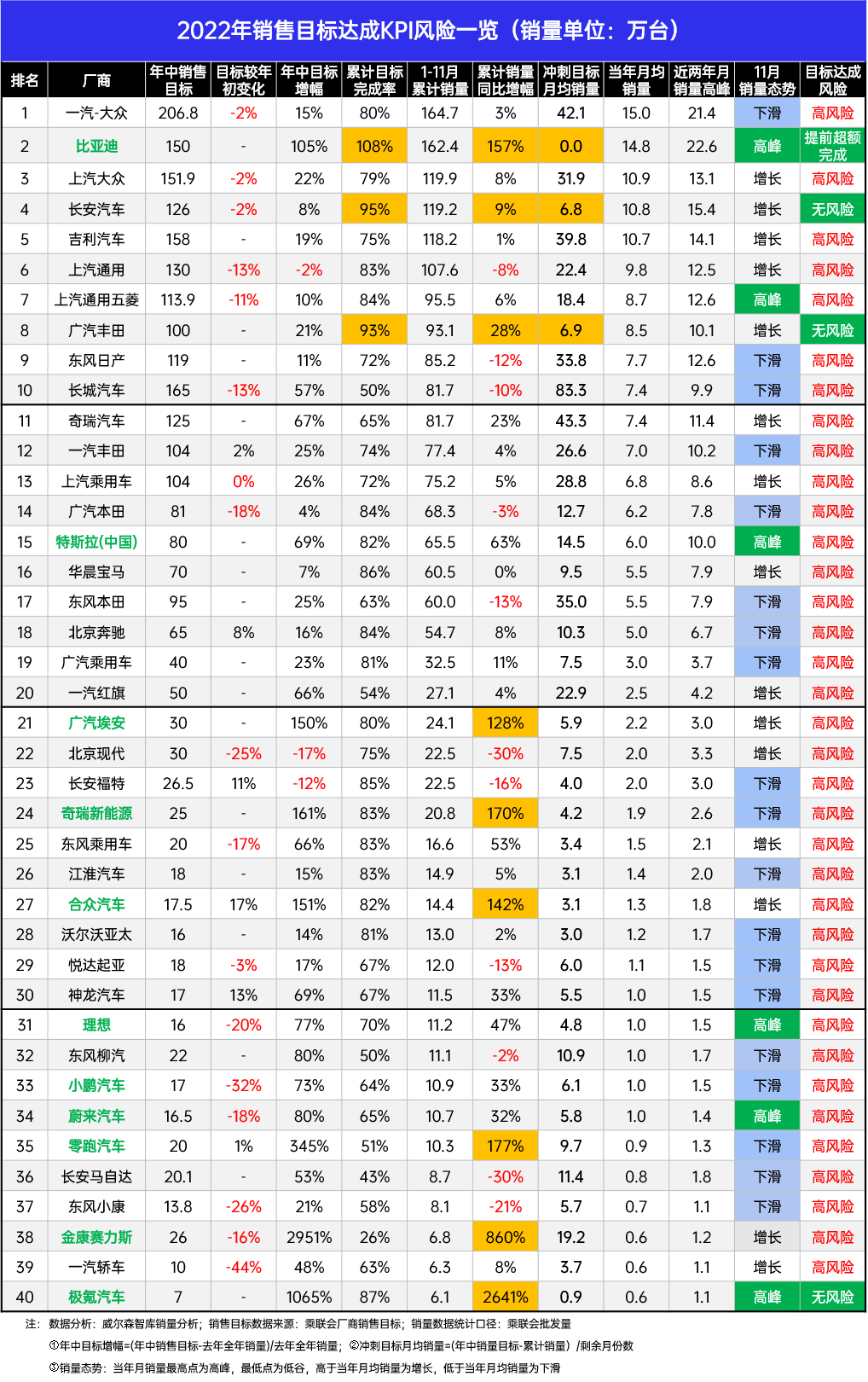 今年大露头角的零跑汽车和金康赛力斯,销量飞速爬升,与1-11月累计目标完成率只有51%和26%的表现反差极大,主要还是目标设定过高显得有点太心急了。