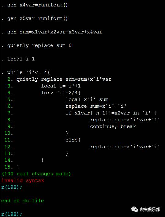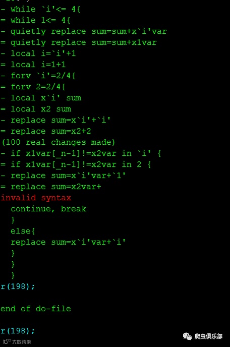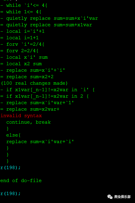 此时Stata给出了详细的运行过程和错误出现的具体位置,十分方便自己确定命令出错的具体原因,例如在本案例中编写命令时候混淆了i和1。