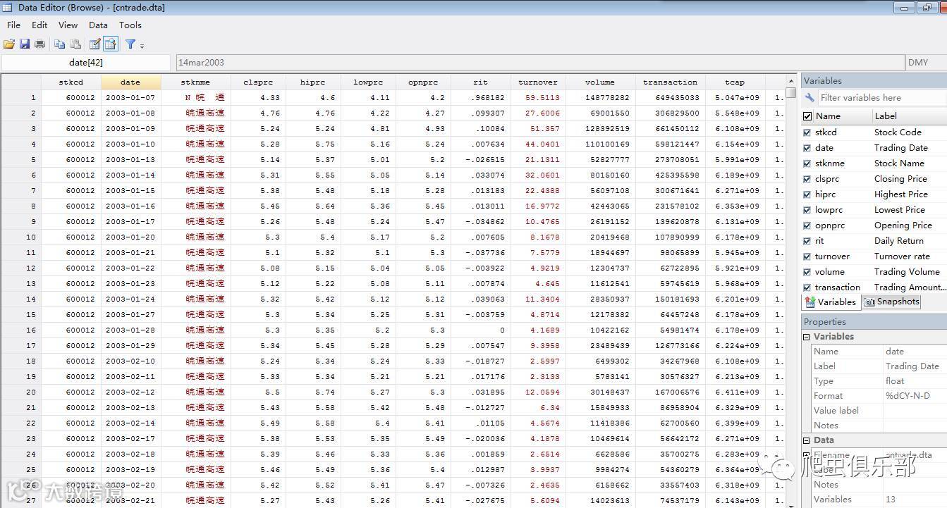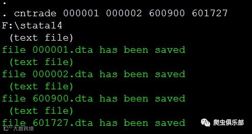 我们在这里简单介绍下:cntrade命令能够下载上市公司交易数据;chinafin能够下载上市公司财务数据;cnintraday命令能够下载上市公司分时交易数据。这些命令都是我们爬虫俱乐部推出的命令,关于这些命令的详细用法可以参考我们往期的推文《天路——chinafin与cntrade命令》、《分时数据,从此唾手可得》。