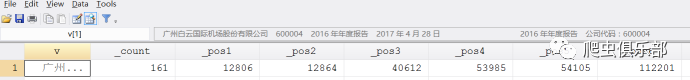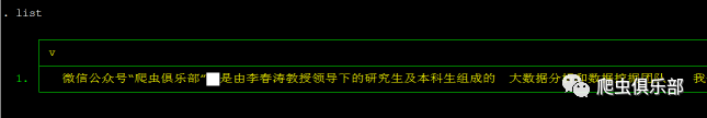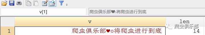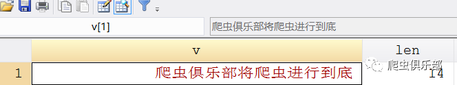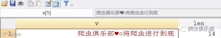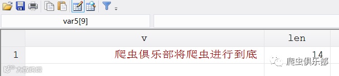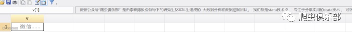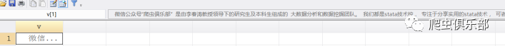 注意了!我们点击v[1]这个观测值,在stata的上方的编辑框中却只显示“爬虫俱乐部”!好是奇怪,我们接着看一下,这个观测值的unicode字符长度: