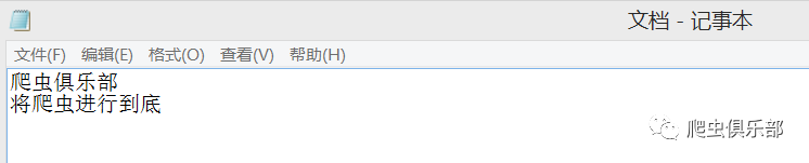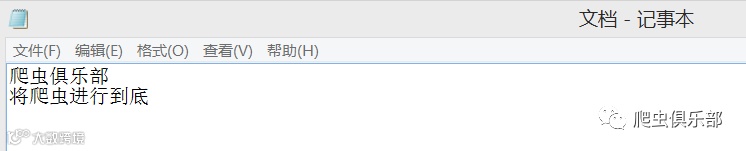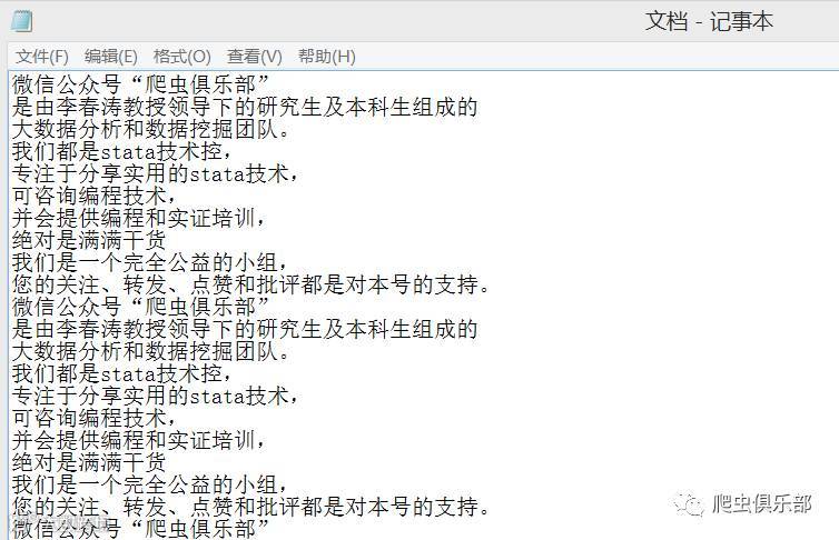 我们还延续上篇推文中的例子,先用file命令生成一个命名为“文档”的txt文件,这个txt文档一共有两行,第一行为“爬虫俱乐部”;第二行为“将爬虫进行到底”,且文档末尾不以换行符结尾。然后我们再用fileread函数导入stata: