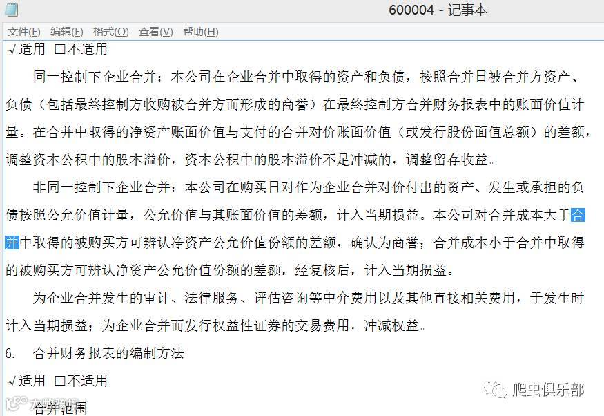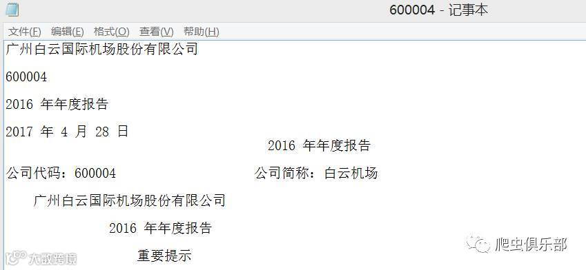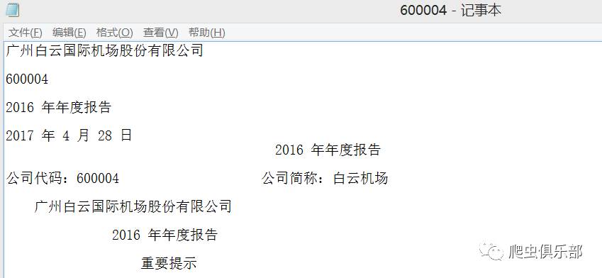 这里统计出来的“合并”一词为162个,而文章开头统计的个数为161,说明被分在两行的“合并”被统计到了。这时候我们又发现一个问题,在stata编辑框中“2017年4月28日”与“2016年年度报告公司代码:600004”之间依然有一些空白字符,为了方便观察,下边给出对应的文本文档: