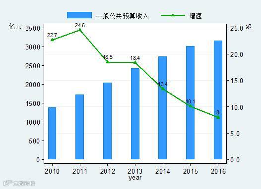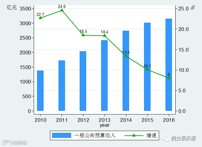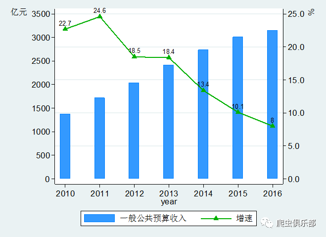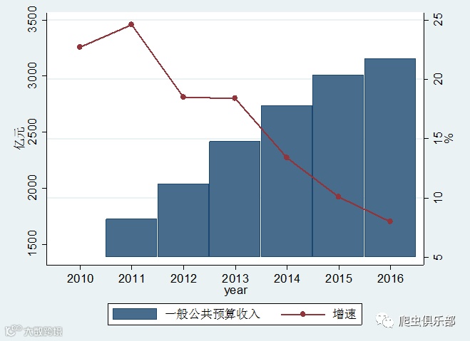 ·twoway bar 一般公共预算收入 year,yaxis(2) ylabel(,axis(2)) ytitle(亿元,axis(2)) || ///