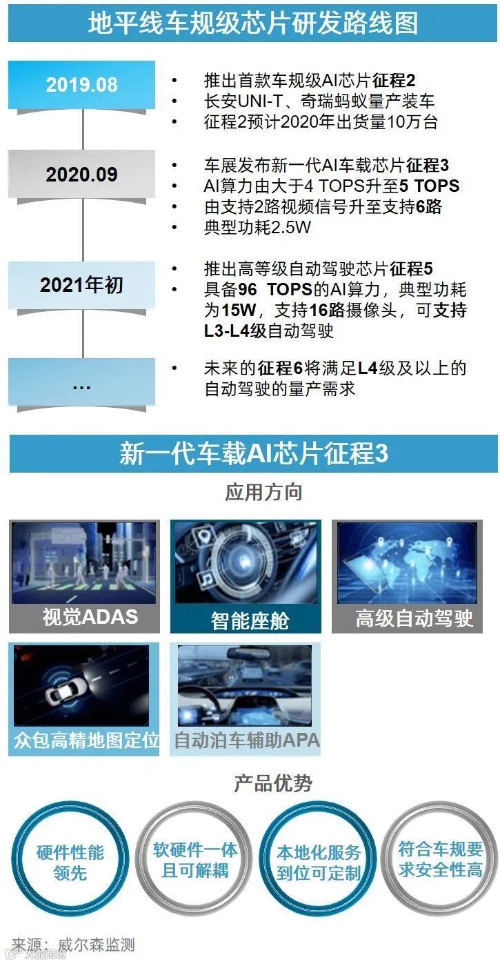 车展上,地平线正式发布新一代高效能车载AI芯片征程3,采用16纳米工艺,基于自研BPU2.0架构,AI算力达到5 TOPS,典型功耗2.5W,支持智能座舱、自动泊车辅助、高级别自动驾驶及众包高精地图定位等应用场景。