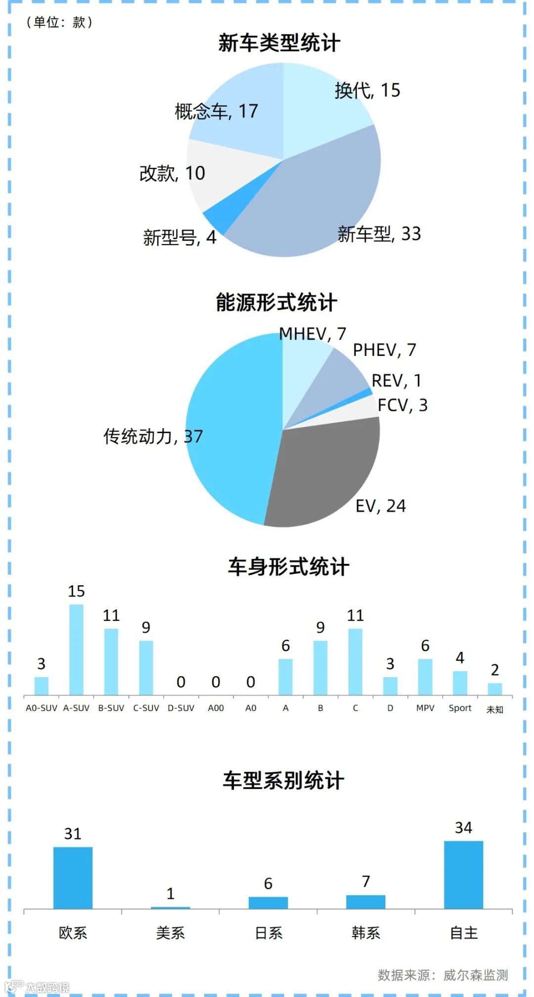 北京车展展出重磅新车达79款,新车型多达33款,此外,传统能源车型达37款,与新能源车型的35款基本持平;本届车展SUV车型达38款,其中A-SUV数量最多,为15款。