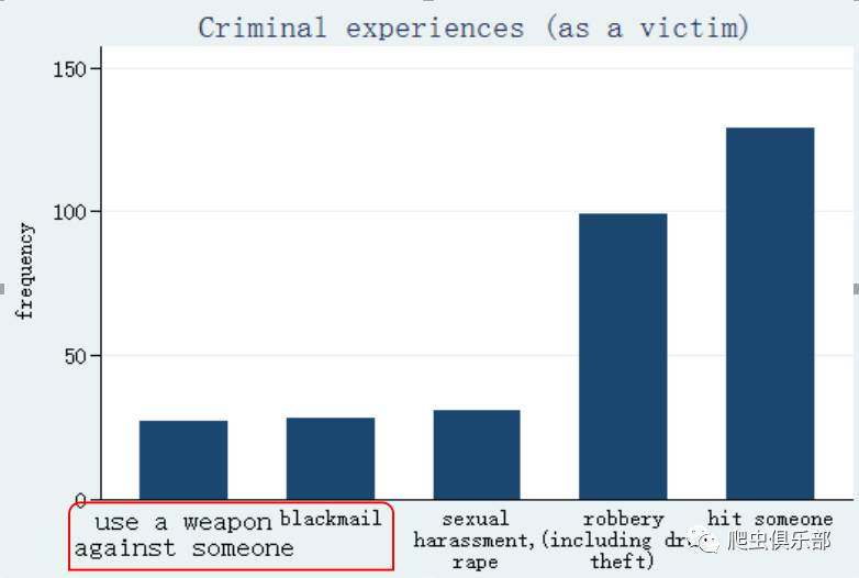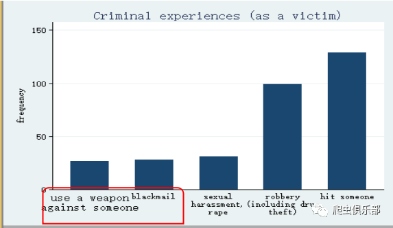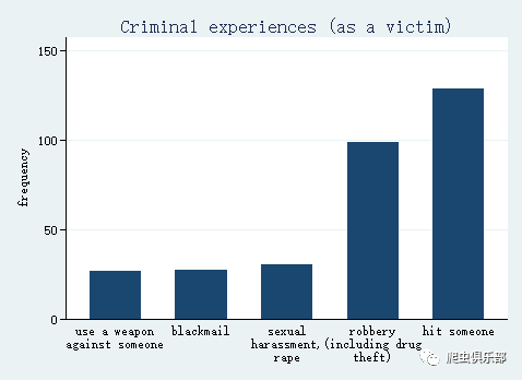 mrgraph bar crime1-crime5, include response(2 3) sort width(15) title(Criminal experiences (as a victim)) ylabel(,angle(0))