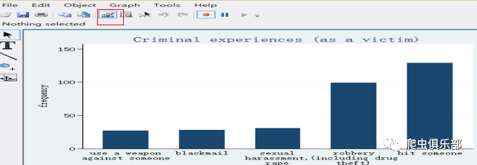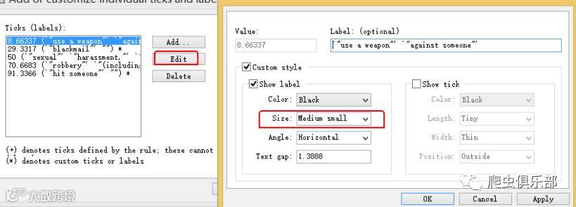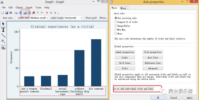 对于五种犯罪标签我们如何字体大小一般我们使用图形编辑器,首先通过点击左图红框图形进入图形编辑环境,然后通过双击x轴标签可以得到右下图: