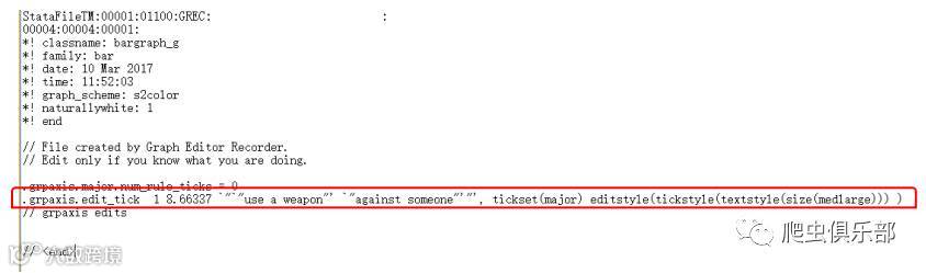 gr_edit grpaxis.edit_tick 1 8.66337 `"`"use a weapon"' `"against someone"'"', tickset(major) editstyle(tickstyle(textstyle(size(medlarge))) )
