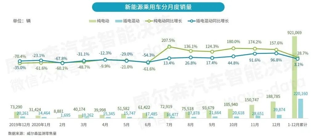 12月新能源市场销量约为22.9万辆,环比增长27.5%,同比增长144.4%;2020年累计销量114.1万辆,年度突破100万辆,累计同比上升22.9%。