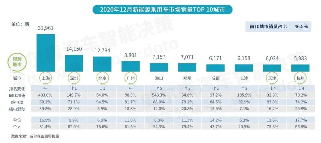 12月,前10城市销量占比为46.5%;大部分限牌城市销量排名靠前;上海市销量破3万,位列第一,海口市排名上升至第五位,长沙市跻身榜单第八位。