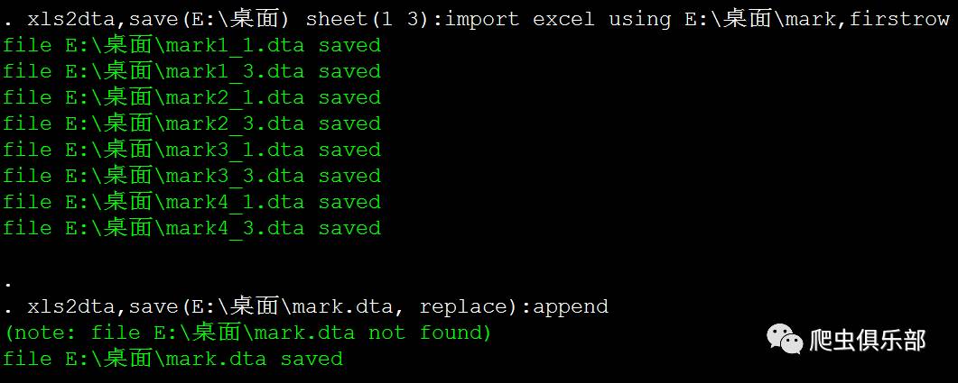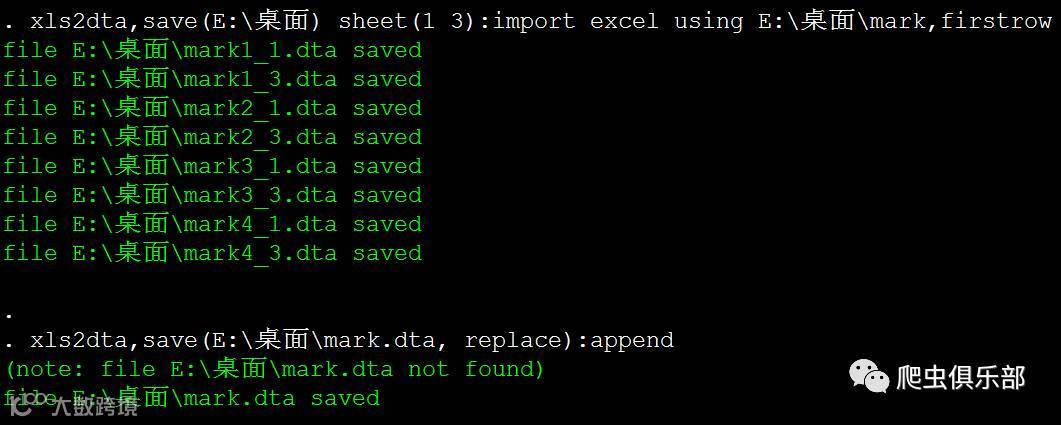 xls2dta,save(E:\桌面\mark.dta, replace):append