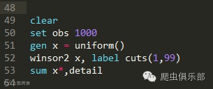 这条命令的语法很简单,比如,要对随机生成的变量x做winsorize处理,代码如下: