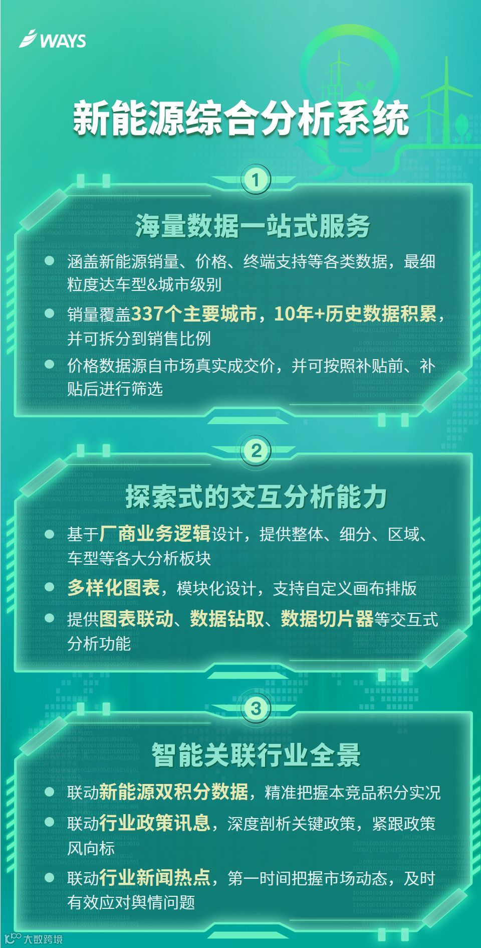系统汇集市场分析、产业数据应用、行业政策分析、双积分跟踪等多个板块,实现一站式信息服务功能,清晰呈现新能源汽车市场发展特点,为您的决策提供有力的参考依据。