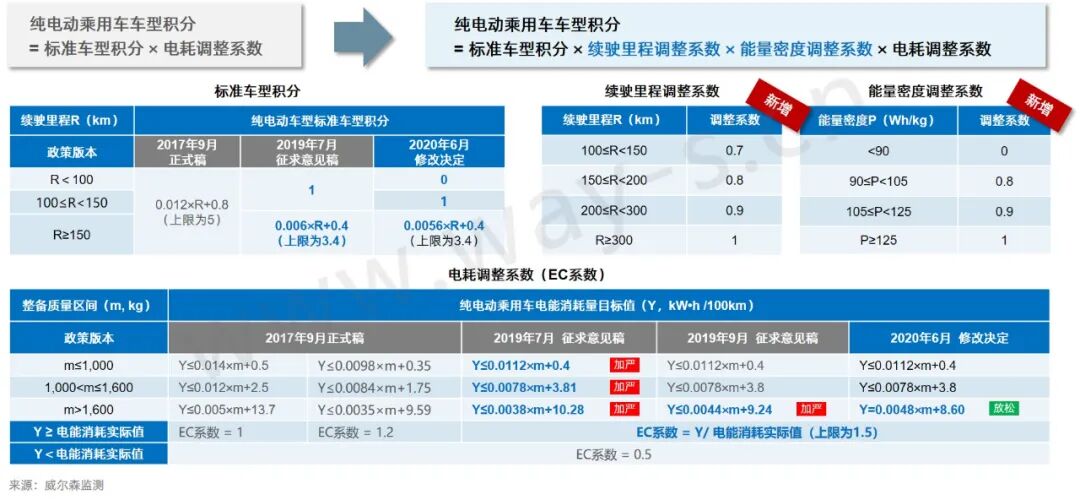 纯电动乘用车车型积分计算方式有较大变化,参照了新能源补贴的计算逻辑,进一步弱化续航里程的权重,综合车型的续航里程、能量密度和电耗进行考核,贯彻对新能源汽车“扶优扶强”的政策路线和发展方向。