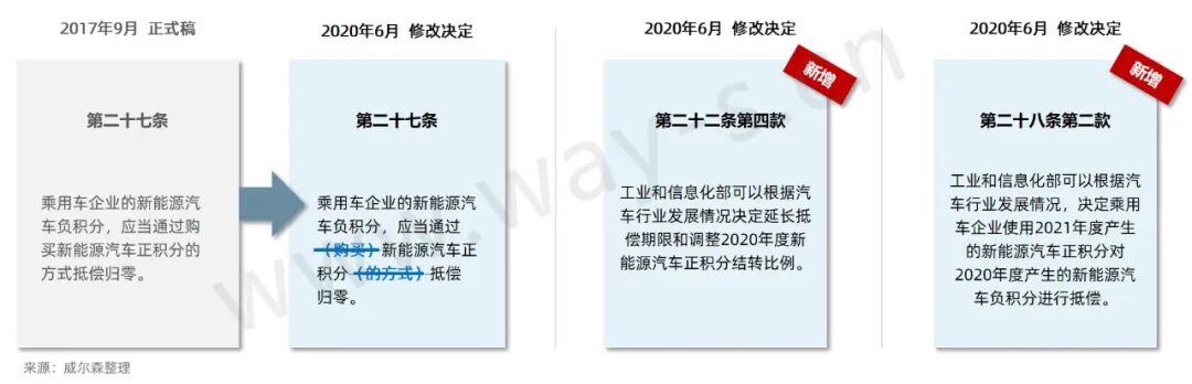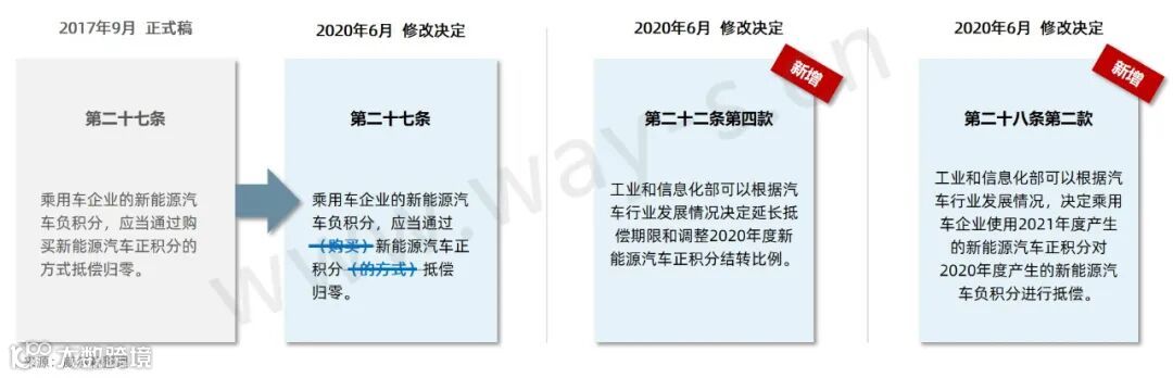 双积分政策在2019年历经两次《管理办法》修改公开征求意见,2020年6月22日《关于修改〈乘用车企业平均燃料消耗量与新能源汽车积分并行管理办法〉的决定》正式发布,自2021年1月1日起施行。