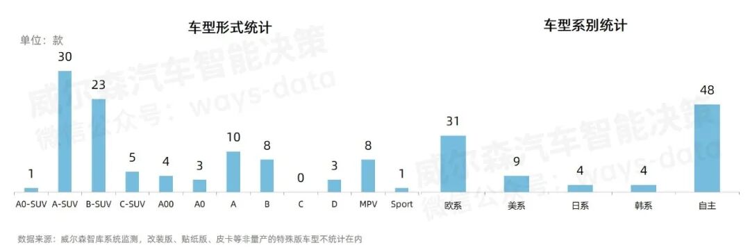 本届车展SUV车型达59款,A级SUV数量最多,为30款;自主品牌此次车展发布新车最多,共48款,占一半份额。