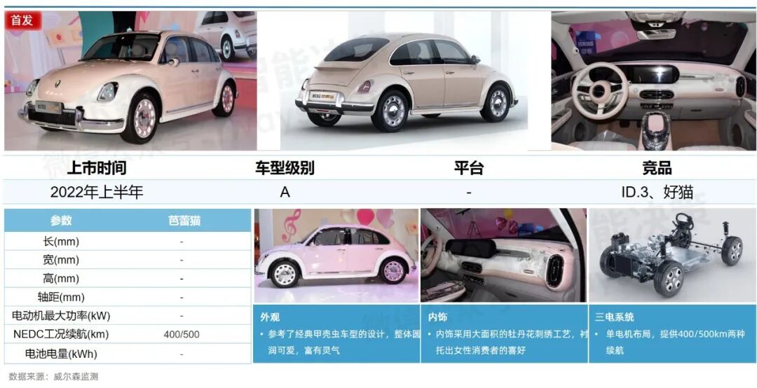 新车看点:参考经典甲壳虫设计、造型可爱灵动、内饰牡丹花刺绣工艺、400/500km续航可选。