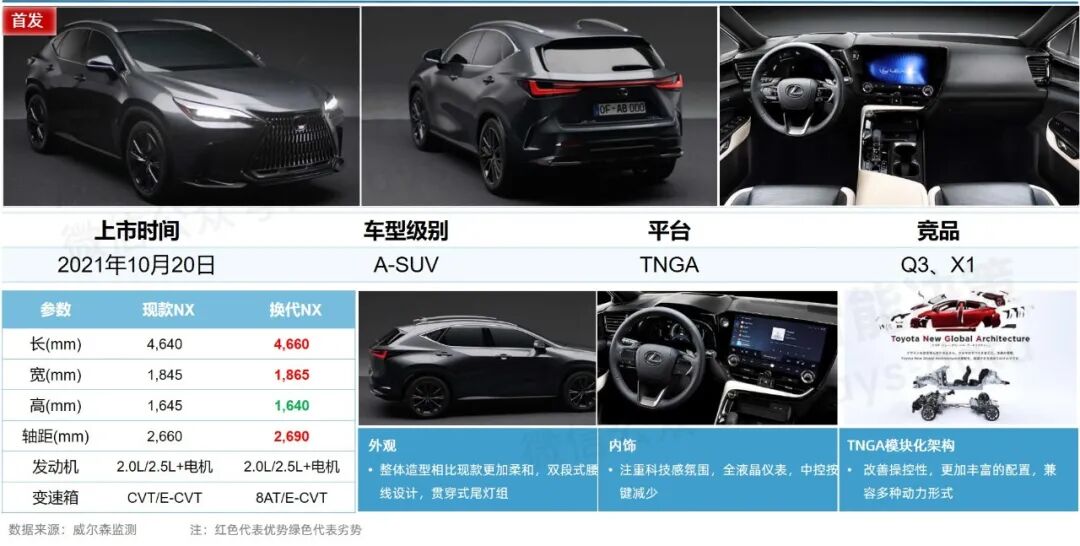 雷克萨斯 换代NX 新一代雷克萨斯NX基于TNGA模块化架构打造,整体造型相比现款更加柔和,新车此前于粤港澳车展首发,此次成都车展亮相。