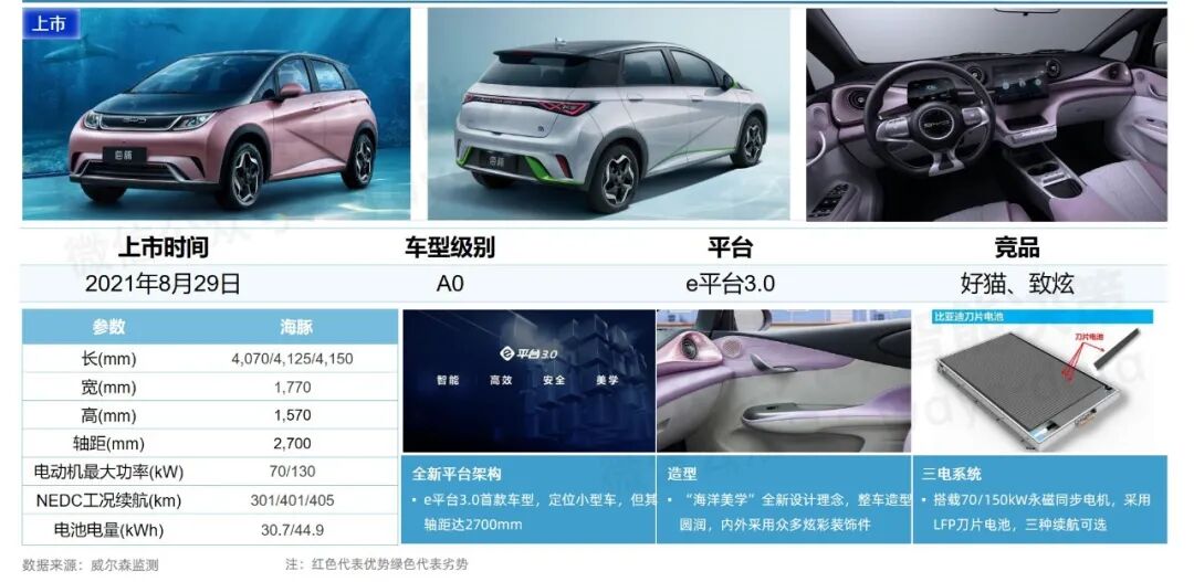 新车看点:基于e平台3.0打造、“海洋美学”设计、个性化选择、12.8英寸可旋转中控屏、301/401/405km续航可选,磷酸铁锂刀片电池。