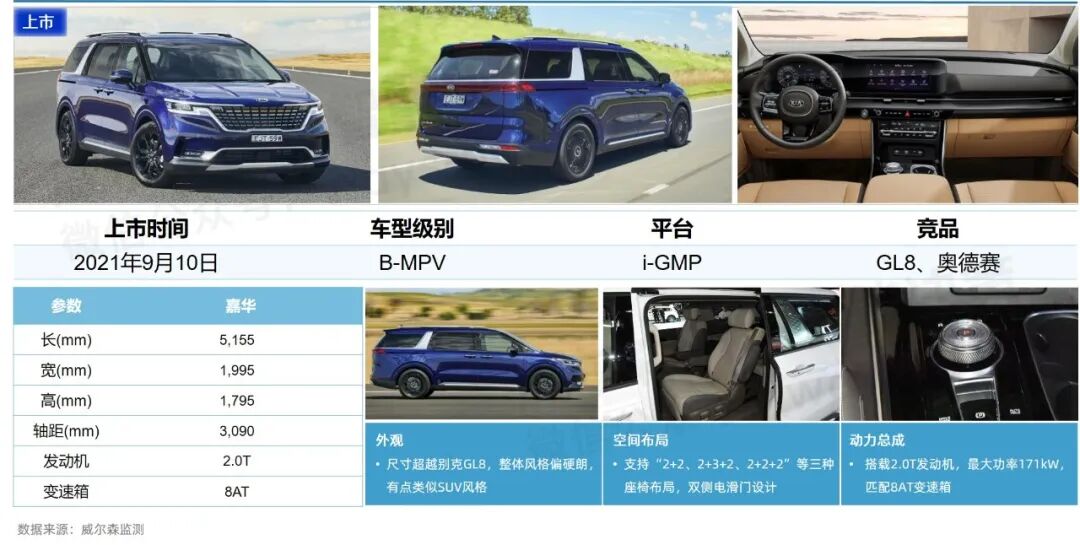 新车看点:偏SUV硬朗型风格的MPV、贯穿式尾灯、双侧电动门、三种内饰座椅布局、双12.3寸贯穿一体联屏设计,2.0T+8AT动力总成。