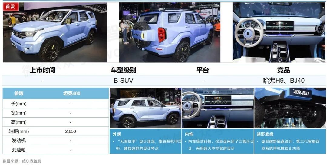 长城汽车 坦克400 坦克400与坦克500都定位于中型越野型SUV,但两款车产品受众人群不同,400更偏向于硬汉粗犷越野风格,新车于成都车展首发。