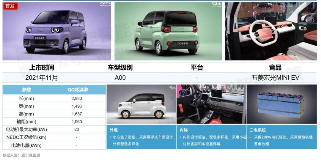 新车看点:微型两座小车、小方盒子造型、内饰造型年轻简洁、个性化选择多样化、对标宏光MINI EV。