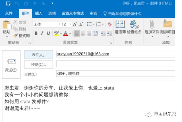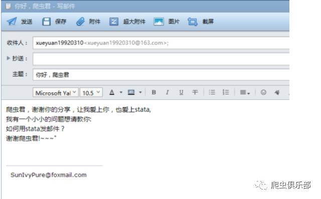 Body(正文): 爬虫君,谢谢你的分享,让我爱上你,也爱上stata,(换行)我有一个小小的问题想请教你:(换行)如何用stata发邮件?(换行)谢谢爬虫君!~~~